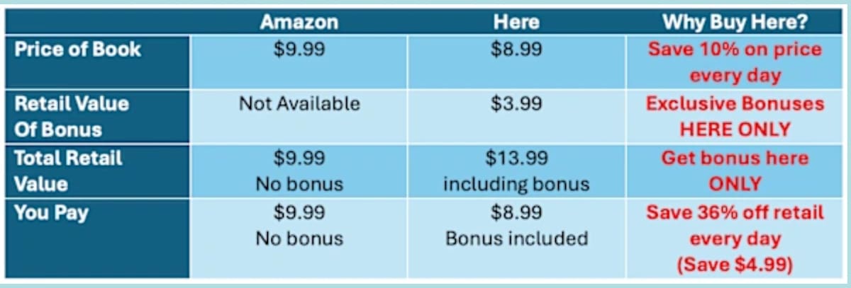 - You save money. Buying this book elsewhere would cost more — and Amazon doesn’t include the bonus at all.