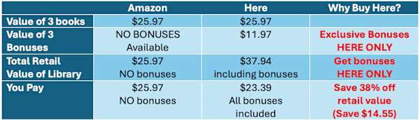 ✔ Lower price — same books + bonuses. Amazon charges more and offers none of the exclusive bonuses.
