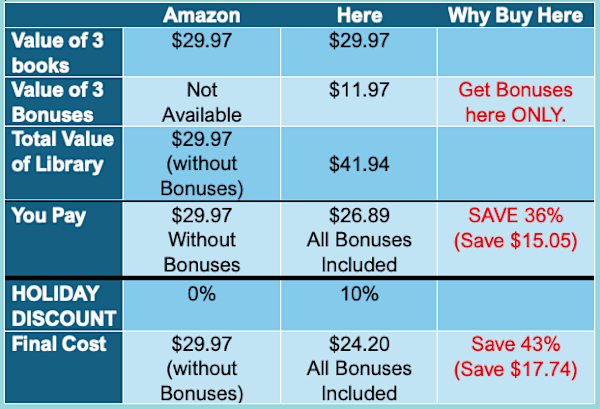 ✔ Lower price — same books + bonuses. Amazon charges more and offers none of the exclusive bonuses.