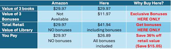 ✔ Lower price — same books + bonuses. Amazon charges more and offers none of the exclusive bonuses.